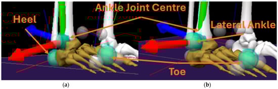Two methods were used to define the ankle angle in the PiG model. Firstly, the standard PiG method was employed, as described by CMotion (2022) [16] (Figure 1a). Secondly, an alternative method defined the foot segment with the proximal joint centre as the ankle joint centre (AJC), the distal joint centre as the toe and the lateral ankle marker as the lateral marker to define the segment orientation (Figure 1b). Reliability of these two approaches were compared.