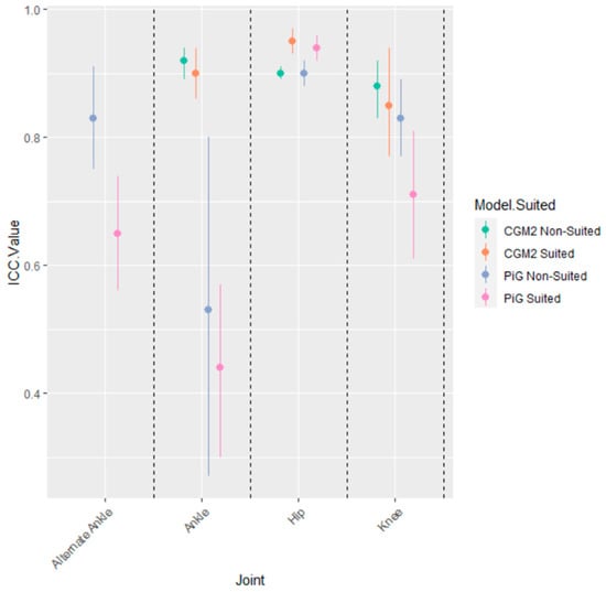 The CGM2 model seems to be a much more reliable alternative to the PiG model when using MOCAP suits, with good to excellent reliability across all joints in both suited and non-suited conditions (ICC: 0.769–0.965). The least reliable joint was the knee with an average ICC of 0.855. The non-suited condition did not perform significantly more reliably at any of the three joints and, as a result, the use of MOCAP suits in conjunction with the CGM2 model can be recommended as an alternative to placing markers directly onto the skin to repeatedly assess ankle, knee and hip angles in the sagittal plane. These results are comparable to the reliability of the CGM2 model reported by Okahisa et al. (2023) [4], who reported sagittal ICC values of the ankle, knee and hip between 0.73 and 0.93.