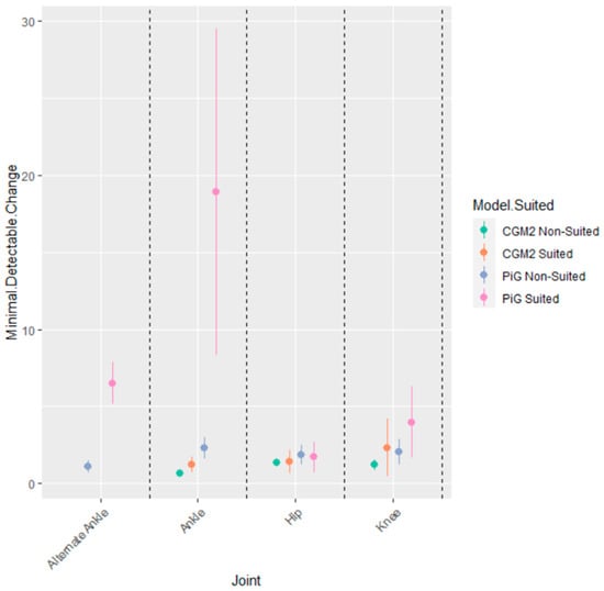 For ankle angle, there are significant differences in the PiG MDC with the non-suited trials (2.32°) compared to the suited trials (18.90°). The difference between the conditions, not observed in the ICC values, arises from the inclusion of the standard deviation (SD) when calculating the SEM (Equation (1)), which is in turn used to calculate the MDC (Equation (2)). We see smaller and non-significant differences between the knee (non-suited = 2.06°, suited = 3.98°) and hip (non-suited = 1.88, suited = 1.71) angles across conditions.