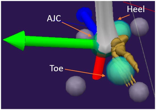 The source of error resulting in PiG poor reliability of the ankle angle and the large MDC in the suit was identified as inconsistent placement of heel and toe markers. The PiG relies on careful alignment of these markers with the AJC. If toe and heel markers are not aligned with the AJC, incorrect inversion/eversion of the foot segment will ensue (Figure 4). This altered measured ankle angles by up to 80°, reducing reliability. This error was observed in both conditions, but was more common in suited trials. The alignment of the heel, AJC and toe becomes particularly difficult when using the MOCAP suit slippers which are bulky and poorly fitting, making it hard to consistently mark-up toe and heel markers.
