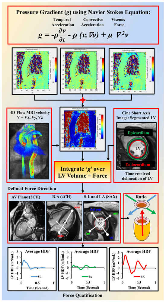 The method was adapted from the work of J. Töger et al. for HDF calculation. This study used the semi-automated ‘Segment’ software v2.2 R6410 (Lund, Sweden, Medviso) for image processing. This software is freely available, and all the post-processing steps were described and validated in detail by J. Töger et al. The ‘Segment’ software is designed to analyze 4D-flow data, provided that the cine and 4D-flow MRI data can be loaded into it [21]. The overall force extraction method is illustrated in Figure 1. Intraventricular pressure gradients (g) were computed from 4D-flow velocity data using Navier–Stokes equations (Equation (1)) [35], and HDF was computed by integrating ‘g’ over the entire LV cavity (Figure 1).