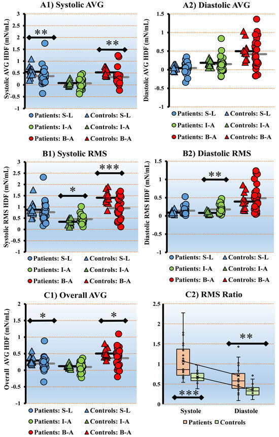 Figure 2 demonstrates the visual presentation of the statistical differences between controls and patients with MR for systolic–diastolic average (AVG) HDF in the S-L, I-A, and B-A directions (Figure 2(A1,A2)); systolic–diastolic RMS HDF in the S-L, I-A, and B-A directions (Figure 2(B1,B2)); overall AVG HDF (Figure 2(C1)); and RMS ratios (Figure 2(C2)). This outcome highlights the importance of considering hemodynamic forces when evaluating patients with MR. Table 3 presents the distinctive numerical values indicating only significant differences in HDF between controls and patients with MR. The full analysis will be available in Supplementary Table S1.