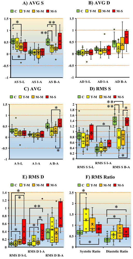 The discernible differences between controls and across various MR severities. The post hoc tests showed further pairwise differences within mitral severities. (A) shows that as the severity increases, the systolic AVG HDF decreases compared to controls. Diastolic AVG did not show any significant difference (B). (C) demonstrates a sudden rise in overall AVG HDF in the B-A direction among the moderate–severe MR compared to controls. The systolic RMS in the I-A direction demonstrated a higher and the B-A direction demonstrated a lower mean value compared to controls (Panel (D)). The I-A direction showed a higher and the S-L direction showed a lower mean till trivial–mild MR and then showed an increased mean value towards severe MR (E). Both systolic and diastolic ratios were higher in MR patients than controls (F). Notes: p-value < 0.05 *, p-value < 0.01 ** (2-tailed). Abbreviations: AVG = average; RMS = root mean square; HDF = hemodynamic force, B-A = base-apex, S-L = septal–lateral; I-A = inferior–anterior; MR = mitral regurgitation; A = average; S = systole; D = diastole; C = controls; T-M = trivial–mild; M-M = mild–moderate; M-S = moderate–severe.