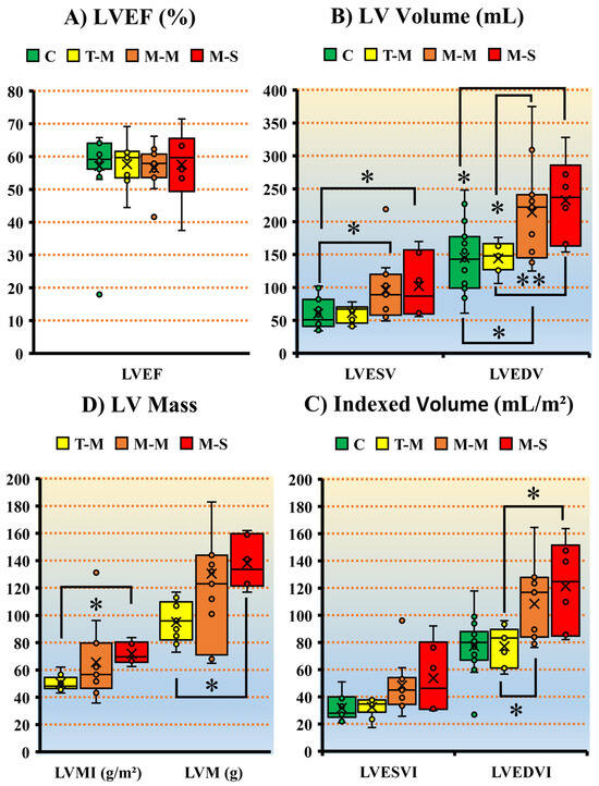 The distinct differences in LV function between controls and across various MR severities. The post hoc tests showed further pairwise differences within mitral severities. (A) shows insignificant differences in LVEF. (B) demonstrates the differences in LVESV and LVEDV between controls and MR patients. (C) demonstrates notable differences only for indexed LVEDV within MR patients. No differences were observed in the LVESVI (p-value > 0.05). (D) shows the differences in LVM and LVMI within MR patients. All LV functions demonstrated an increasing trend with rising MR severity. Notes: p-value < 0.05 *, p-value < 0.01 ** (2-tailed). Values were missing in the controls for LVM and LVMI due to the retrospective nature of data collection. Therefore, the comparison was performed within the MR severities. Abbreviations: LV = left ventricle; MR = mitral regurgitation; EF = ejection fraction; LVESV = LV end-systolic volume; LVESVI = LVESV indexed; LVEDV = LV end-diastolic volume; LVEDVI = LVEDV indexed; LVM = LV mass; LVMI = LVM indexed; C = controls; T-M = trivial–mild; M-M = mild–moderate; M-S = moderate–severe.