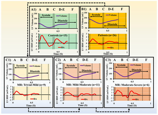 The average HDF and LV volume distribution pattern in one cardiac cycle. (A1,B1) demonstrate the average volume and HDF among all controls and MR patients. (C1–C3) demonstrate the average volume and HDF among mitral patients with trivial–mild, mild–moderate, and moderate–severe severity. The B-A HDF showed a significant reduction where the volume was elevated among severity levels compared to controls (p-value < 0.05). Notes: The cardiac phases are delineated as A to F: A = isovolumic contraction; B = systolic ejection; C = isovolumic relaxation; D = early diastolic relaxation; E = diastasis, and F = late diastolic filling (atrial contraction). A-C = systolic phase and D-F = diastolic phase. Abbreviations: HDF = hemodynamic force; LV = left ventricle; BA = basal–apical; MR = mitral regurgitation.