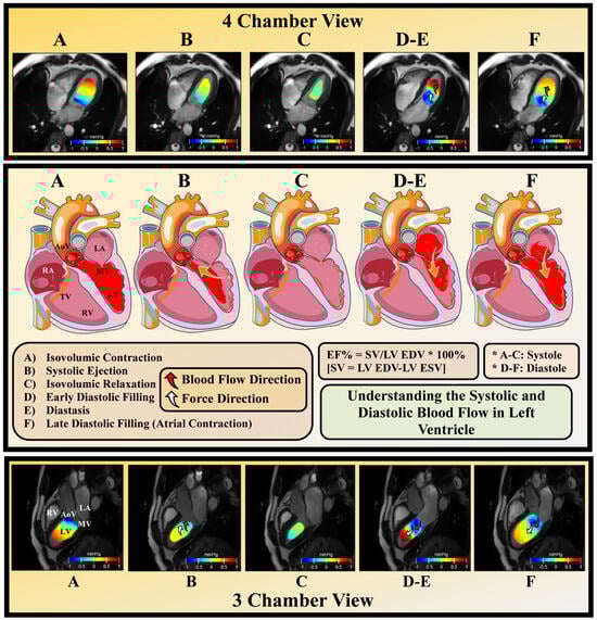 Figure 6 provides a comprehensive depiction of blood flow dynamics within the cardiac cycle, which is the period from the beginning of one heartbeat to the beginning of the next one. It consists of two parts: ventricular contraction (systole) and ventricular relaxation (diastole). Each part of the cardiac cycle consists of several phases, characterized by either significant pressure changes with constant volume or volume changes accompanied by relatively small pressure changes. The phases are delineated as A to F: A = isovolumic contraction, B = systolic ejection, C = isovolumic relaxation, D = early diastolic relaxation, E = diastasis, and F = late diastolic filling (atrial contraction). The systolic phases are denoted as A-C and the diastolic phases are denoted as D-F [15]. HDF was computed based on the pressure exerted by blood, aligning with the direction of blood flow. Therefore, this section will show the changes in the pressure gradients in every phase according to the blood flow dynamics. Since the distribution of volume and blood flow follows the same trend with a variation in magnitude. Thus, we have demonstrated a case of a 65-year-old male patient with trivial–mild MR for understanding purposes. In the isovolumic contraction, the ventricles contract so all valves are closed, and no blood is ejected. Therefore, the ventricular pressure rose considerably without any change in the ventricular volume. The blood volume in the ventricles was considerably equal to the end-diastolic volume (Figure 6A). During the first part of the systolic ejection, the ventricular pressure rose, and blood was intensively ejected to the arteries (rapid ejection). As the blood volume in the ventricles decreased, the ventricular pressure started to decline in the second part of this phase (Figure 6B). The ventricular relaxation led to a significant pressure decrease. The ventricular pressure at the end of an isovolumic relaxation was close to zero in both ventricles (Figure 6C). In the early diastolic filling and diastasis phase, the ventricles were rapidly filled with the blood cumulated in the atria before the opening of the AV mitral valve. This phase accounts for most of the ventricular filling. Although the ventricular volume increased, the ventricular pressure did not change significantly due to the ventricular relaxation. Figure 6D,E demonstrates the pressure right before the opening of the atrioventricular mitral valve. As the ventricular myocardium was relaxed, the ventricular pressure did not change significantly. The blood pressure in both ventricles was almost zero (Figure 6F).