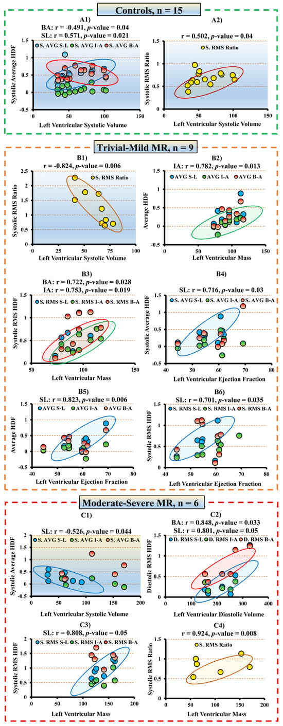 The correlation between HDF and LV function. (A1–A2) shows the correlation among healthy controls. Systolic average S-L (A1) demonstrated a positive correlation, while the systolic average B-A (A1) and the systolic RMS ratio (A2) showed a negative correlation with systolic volume. (B1–B6) shows the correlation among the patients with trivial–mild MR. Panel (B1) shows a negative correlation between systolic volume and systolic RMS ratio. Panel B1 demonstrates an altered correlation compared to controls (A2). Panels (B2,B3) shows the correlation between LVM and average I-A (B2), systolic RMS I-A, and B-A (B3). Panel B4-B6 shows a strong positive correlation between LVEF and systolic AVG S-L, AVG S-L, and systolic RMS S-L. (C1–C4) demonstrates the correlation among the patients with moderate–severe MR. (C1) shows the negative correlation between systolic volume and systolic AVG S-L, revealing an altered correlation compared to controls (A1). (C2) shows a strong positive correlation between diastolic volume and diastolic RMS in the S-L and B-A directions. (C3,C4) demonstrate a positive correlation between LVM and systolic RMS in the S-L direction and systolic ratio, respectively. Notes: The correlation was considered statistically significant when the p-value < 0.05. Blue oval = correlation for S-L direction; green oval = correlation for I-A direction; red oval = correlation for B-A direction. Abbreviations: HDF = hemodynamic force; AVG = average; S-L = septal–lateral; I-A = inferior–anterior; B-A = basal–apical; RMS = root mean square; LV = left ventricle; LVM= LV mass; EF = ejection fraction; MR = mitral regurgitation; S = systolic; D = diastolic.