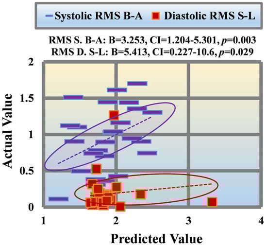 The multivariate linear regression model was statistically significant in predicting MR [F (17,23) = 3.414, p-value = 0.003]. The overall model explained a substantial proportion of the variance in MR (R² = 0.716, Adjusted R² = 0.506). A positive coefficient [Beta, B = 3.253, 95% CI (1.204–5.301), p-value = 0.003] in systolic RMS B-A indicated a potential predictor of increased MR severity. Similarly, a positive coefficient [B = 5.413, 95% CI (0.227–10.6), p-value = 0.029] in the diastolic RMS S-L direction suggested its potential as an indicator for increased MR severity. The visual representation of the predictive result is presented in Figure 8.