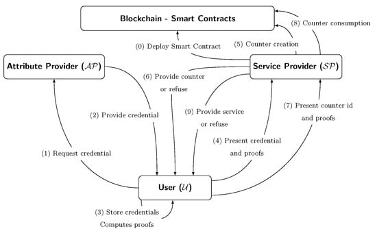 The system involves three different entities: the User (), an Attribute Provider (), accountable for proclaiming certain user attributes, and a Service Provider (), granting access to a service. As detailed in the use case in Section 6, consider a user () whose income is below the minimum wage, a requirement certified by . This user is then granted thirty free underground trips per month. The process involves obtaining credentials from , storing them locally, and presenting these blinded credentials along with proof of private key possession to .