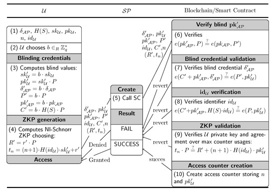 - sends the identifier , the anonymous credentials , , , , , n, and the NI-Schnorr ZKP proof of the private key () by calling the Create function of who, in turn, calls a Smart Contract with these values.