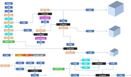 The construction of the GS bottleneck module is illustrated in Figure 6a. Following this, we have designed the cross-layer part of the network, the VoV-GSCSP module, using a one-time aggregation approach. The VoV-GSCSP module maintains satisfactory accuracy while reducing computational and architectural complexity. Figure 6b depicts the construction of the VoV-GSCSP module. Moreover, the SlimNeck was designed with hardware-friendliness in mind, facilitating easier deployment and operation across various hardware platforms. Therefore, replacing the neck part of YOLOv7-tiny with SlimNeck not only maintains good performance, but also enhances efficiency and broadens potential applications.