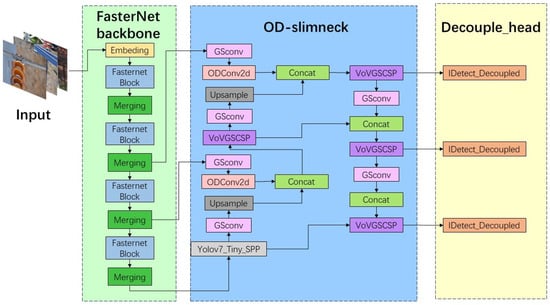 The improved YOLOv7-tiny builds upon the original YOLOv7-tiny by incorporating the FasterNet architecture as the backbone network, introducing the OD-SlimNeck feature extraction framework in the neck part, and utilizing a decoupled detection head. These enhancements reduce the number of parameters while improving the accuracy of insulator defect detection, making it more suitable for target detection in drone aerial images. The framework of the improved YOLOv7-tiny algorithm is illustrated in Figure 2, with its specific structure detailed in the following sections.