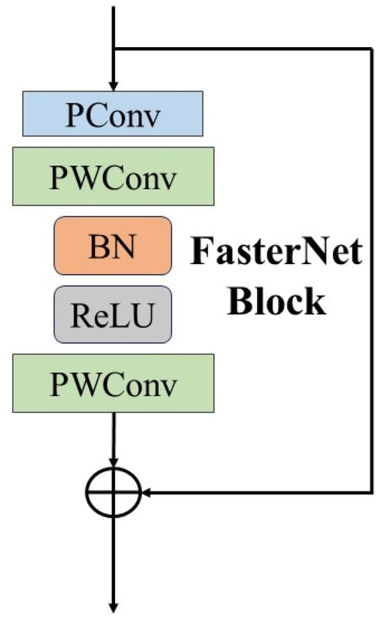 Each FasterNet Block consists of one partial convolution (PConv) layer and two pointwise convolution (PWConv) layers, as illustrated in Figure 4. Moreover, normalization and activation layers play crucial roles in neural networks, serving as indispensable components. In each FasterNet module, Batch Normalization (BN) and Rectified Linear Units (ReLUs) [] are integrated into the two PWConv layers. BN enhances training speed and accuracy, while the ReLU, serving as the activation function, accelerates model training and mitigates the issue of vanishing gradients. Positioning the normalization and activation layers between the two PWConv layers of each FasterNet module helps reduce latency and maintain feature diversity.