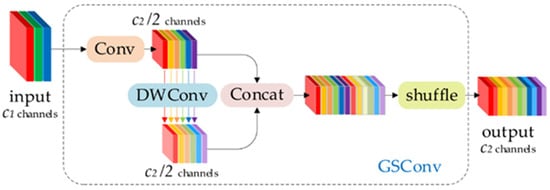 GSConv aims to maintain connectivity throughout its application [], but deploying it across all stages of the model can lead to increased network depth. This additional depth hinders data flow, substantially extending inference times. By the time feature maps reach the neck stage, they are at their most condensed—maximized in channel dimensions and minimized in spatial dimensions—rendering further transformations unnecessary. Consequently, a more efficient strategy is to employ GSConv solely at the neck. Initially, GSConv replaces the lightweight convolutional method, SC, offering a computational cost of about 60–70% of SC, while still providing a comparable impact on the model’s learning capabilities. Subsequently, the GSbottleneck layer is integrated atop GSConv to further enhance the model’s performance. Figure 5 illustrates the structure of the GSConv module.