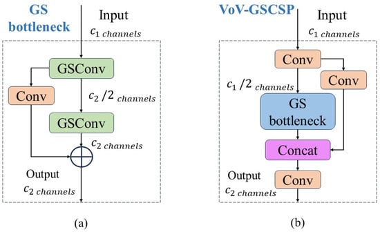 The structures of the (a) GS bottleneck module and the (b) VoV-GSCSP modules.