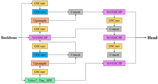 Building on the concepts introduced for SlimNeck and ODConv, we aimed to both reduce the inference speed and complexity of the network’s neck section, while also enhancing the model’s accuracy in detecting insulator defects. Consequently, we propose a novel structure: OD-Slimneck, as illustrated in Figure 8. By integrating the ODConv module following the GSConv module, this structure increases the model’s parameter count minimally, yet significantly boosts the accuracy in detecting small-scale targets such as insulator defects. Replacing the neck network of YOLOV7-tiny with our OD-SlimNeck structure not only utilizes the lightweight SlimNeck design, but also significantly enhances the detection performance for small objects with ODConv compared to standard convolution layers.