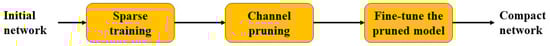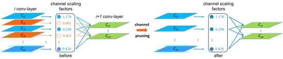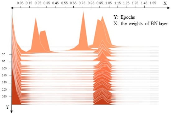 The Batch Normalization (BN) layers are inserted following the convolutional layers that have trainable factors [], where the scaling factor serves as an indicator of channel importance. The loss function used during the sparse training process is as follows: