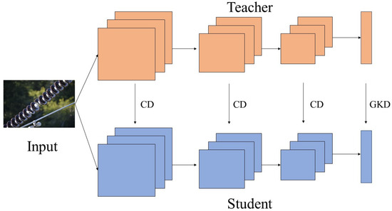 Knowledge distillation has significant applications in computer vision, particularly in the field of object detection, where it is used to reduce model parameters and improve the accuracy of existing models []. After channel pruning, to quickly restore the accuracy of the model, we assist the training of the pruned model through channel distillation. Unlike traditional knowledge distillation (KD), the channel distillation (CD) method transfers channel information from the teacher to the student [].
