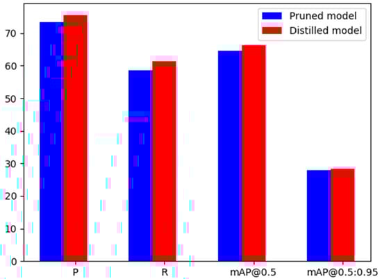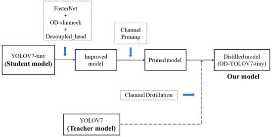 After enhancing the network model as described above, channel pruning was applied, followed by channel distillation to obtain our final OD-YOLOV7-tiny network model. The entire process is illustrated in Figure 13.
