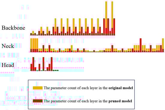 The comparison results are presented in Table 3, indicating that the model parameters are reduced by 49.79%, decreasing the size by 2.7 MB after channel pruning. The forward inference time is reduced by 0.53 ms, while the mAP@0.5 decreased by 4.8%. However, there is a significant reduction in the number of parameters and GFLOPs in the pruned model, and the accuracy of the pruned model is closely comparable to that of the pre-pruning insulator defect detection model. These findings suggest that the aforementioned improved model can be precisely simplified through channel pruning. The changes in the number of channels per convolutional layer in the model after channel pruning are shown in Figure 15. The orange segments represent the number of channels in all convolutional layers of the model before pruning, while the red segments represent the number after pruning. It is evident that the number of channels in most convolutional layers has been substantially reduced, demonstrating the effectiveness of the channel pruning algorithm in decreasing the model’s parameter count.