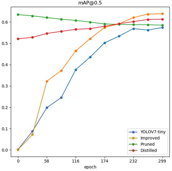 As shown in Table 5, after channel distillation, the resulting distilled model (OD-YOLOv7-tiny), has a parameter size of 2.8 M, which represents a 53% reduction compared to the original YOLOv7-tiny model. In terms of model speed, the inference speed of the original YOLOv7-tiny model was 1.25 ms, whereas the final OD-YOLOv7-tiny model achieved an inference speed of 0.78 ms, marking an improvement of 37.6% and significantly enhancing the speed. Regarding accuracy, the OD-YOLOv7-tiny model shows improvements in precision (P), recall (R), mAP@0.5, and mAP@0.5:0.95 by 3.9%, 5.3%, 2.2%, and 0.3%, respectively, compared to the original YOLOv7-tiny model. These enhancements in both model size and speed were achieved without compromising accuracy. Figure 19 illustrates the mAP@0.5 and mAP@0.5:0.95 throughout the training process for various networks, where the improved model refers to the enhanced network, the pruned model to the network after channel pruning, and the distilled model to the network after channel distillation, which is the final network, OD-YOLOv7-tiny.