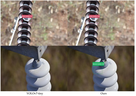 In order to directly test the detection outcomes of the improved OD-YOLOv7-tiny, we randomly selected several images from the test set of our insulator defect dataset, which contained various defects for detection, and conducted a visual comparison with YOLOv7-tiny. Figure 21 illustrates the detection performance of both models in different scenarios. It is evident that the improved OD-YOLOv7-tiny exhibits superior detection capabilities compared to the original YOLOv7-tiny.