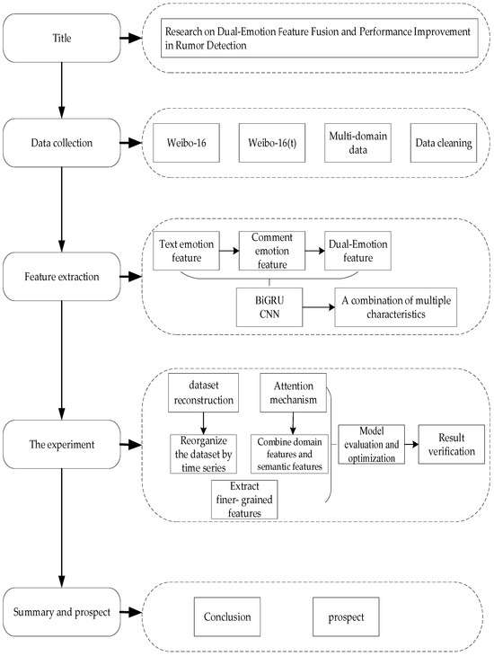 7]. In this paper, emotional signals in rumors and comments are used to extract emotional features, and the relationship between them is determined to establish dual-emotion features. The main research achievements include the following aspects:
