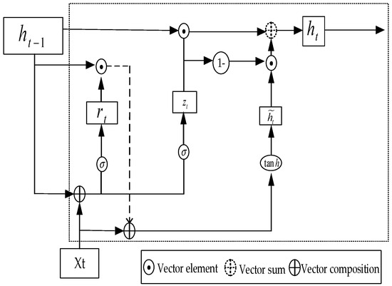 28]. Building a BiGRU semantic analysis model requires the input of historical data into both forward GRUs and reverse GRUs to obtain maximum contextual information. The GRU has no cell state and uses gates to regulate the flow of information inside the unit, improving on the LSTM; the gates are reduced to two, namely, the update gate and the reset gate (z