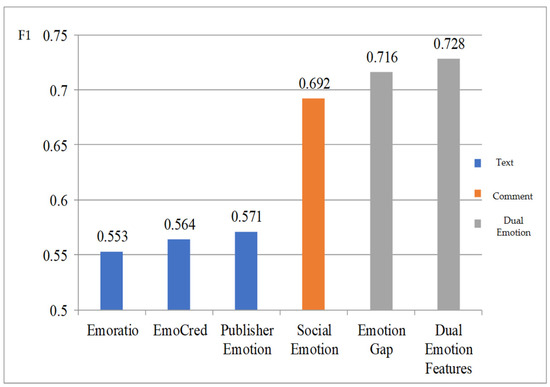 The dual-emotion features significantly enhanced the accuracy of the dataset, and the F1 score was as high as 71.6% when only the emotion gap was used.