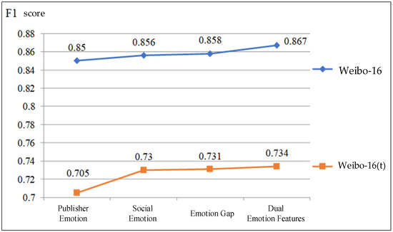 The results of these two models on the two datasets, Weibo-16 and Weibo-16 (t), were comprehensively analyzed. The three components of the dual-emotion features can be used independently in any model to enhance the effect; the improvement of the macro F1 score by supplementing the data with social-emotional features or the emotion gap is greater than that of the publisher’s emotional features, and the performance of social emotions and the emotion gap is relatively consistent. Therefore, among the three emotional characteristics, social emotion and the emotion gap can play a greater role in detection. It is found that, compared with social comments, there are fewer emotional resources available to extract the emotions of publishers, which leads to the insufficient analysis of texts. However, the comment base of rumors is large, which provides sufficient emotional resources for the extraction of emotional features.