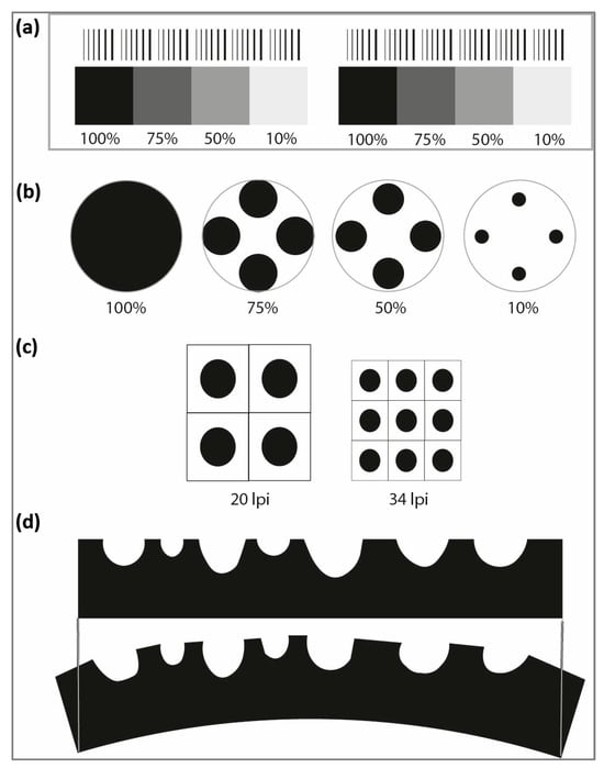The printing plate design: (a) the distribution of the elements on the test plate, (b) the size of the raster points depending on the degree of surface coverage, (c) the comparison of the raster point sizes based on the linearity of the raster, and (d) the elongation of the drawing on the printing plate due to mounting on the plate cylinder.
