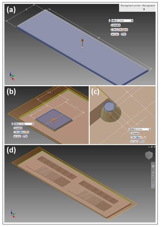 The design steps for the printing plate (a) the creation of a primer layer of 90 mm × 25 mm × 1.2 mm, similar to the pre-exposure process in conventional photopolymer plates, (b) the creation of a solid area on a test plate with a height of 0.5 mm and an inclination of 65° with respect to the base layer, (c) the preparation of a single raster point with dimensions taking into account the elongation in printing, which was then duplicated the appropriate number of times using a rectangular array operation to create a raster field of 10 mm × 10 mm, and (d) a finished design of a 3D-printing form with a linearity of 20 lpc.
