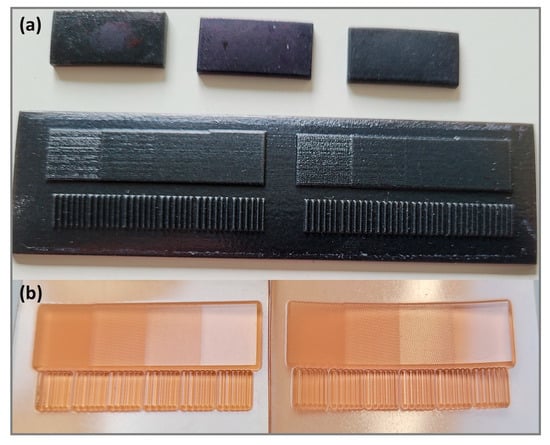 The PolyJet test plates were produced on an Objet Connex350 machine (Stratasys, Tucson, AZ, USA) using TangoBlackPlus FLX9870-DM (Stratasys, Tucson, AZ, USA) photoresin. The resin has the following properties: hardness 68–72 Sh A, tensile strength 3.5–5.0 MPa, elongation at break 65–80%, and tensile tear resistance 15.5–17.5 Kg/cm. The plates (Figure 4a) were printed by RapidPro Company (Wrocław, Poland) based on the provided files containing digital models of the plates (Figure 2). Printing was done in high-quality modes and the layer height was 0.016 mm. The support material was removed using pressurized water at the post-processing stage.