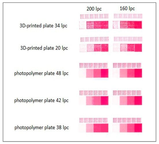 Despite the small differences in SFE values between the 3D-printed and traditional photopolymer plates (42 and 46 mJ/m2, respectively), significant differences in ink transfer to the print substrate were observed (D values of areas were in the range of 0.51–1.5 for L160 and 0.26–1.35 for L200, and 0.67–1.62 for L160 and 0.56–1.46 for L200, respectively). However, these differences in quality were significantly related to the type of substrate used. A significantly better print quality was achieved on coated substrates compared to uncoated substrates (the optical density for uncoated papers was ≤ 1) with the prints made using the 3D-printed plates having a D value that was 10–20% lower than those made with the photopolymer plates. Furthermore, the reproduction of the raster fields was not satisfactory for most of the prints made with the 3D-printed plates, with only the raster fields with 75% coverage on the coated papers being reproduced with a high quality.