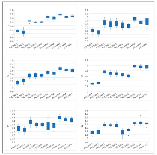 The ANOVA test results for the optical density values (F(59, 540) = 1.346, p = 0) indicate significant differences between the group averages. The magnitude of the differences between the obtained values is significantly influenced by the raster cylinder ruling (F(29, 270) = 1.510, p = 4.1 × 10−196 and F(29, 270) = 1.510, p = 3.3 × 10−186 for L200 and L160, respectively). The prints with a 160 lpc cylinder ruling showed higher D values due to the higher ink capacity of their inkwells, resulting in more ink being transferred to the printing substrates.