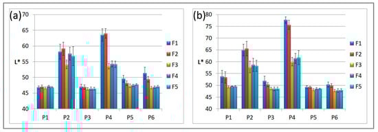 Average lightness of prints obtained on multiple substrates (P1–P6) using different printing plates (F1–F5) and various raster cylinder rulings of (a) 160 lpc and (b) 200 lpc.