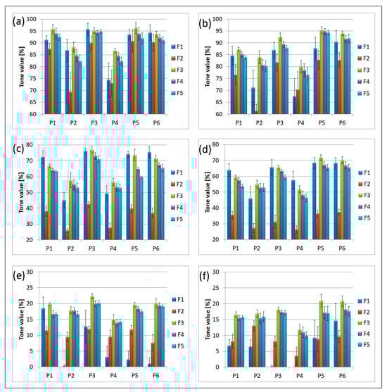 Average measured values of percentage coverage of raster fields of prints made on different substrates (P1–P6) using multiple printing plates (F1–F5) with various raster cylinder rulings of (a) 160 lpc field 75%, (b) 200 lpc field 75%, (c) 160 lpc field 50%, (d) 200 lpc field 50%, (e) 160 lpc field 10%, and (f) 200 lpc field 10%.