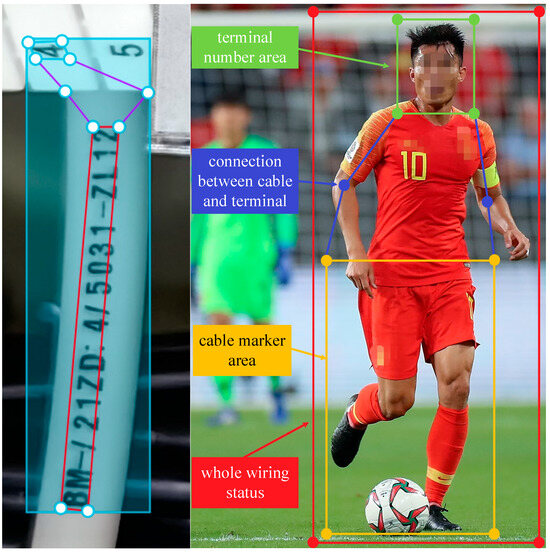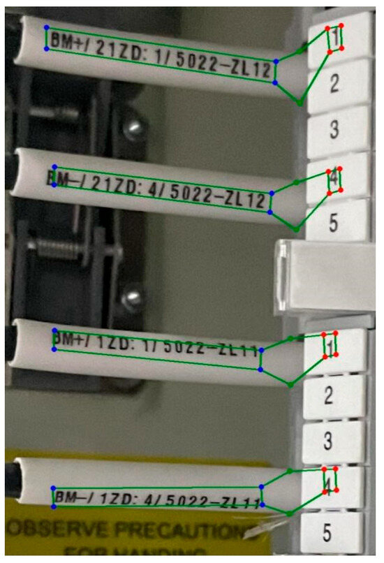 This study relies on an annotated dataset for model training and evaluation, which is derived from actual photos taken inside a substation electrical panel, with over 2500 connections between cables and terminals labeled in 350 images, and the input image size is 640 × 640. The annotation details are shown in Figure 6, with each connection point clearly marked, ensuring consistent labeling and high quality during the training process. To achieve effective model training and fair evaluation, the dataset is divided into training, validation, and test sets in a 7:2:1 ratio.