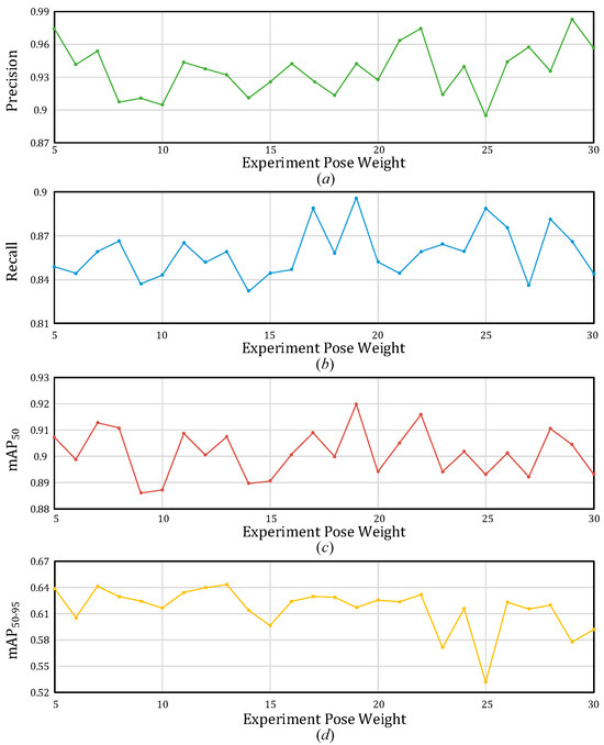 Firstly, while keeping other parameters unchanged, only the key-point loss weight was changed to observe the performance change of the model. In the initial experiment, the key-point loss weight was set to the model’s default value. Subsequently, the weight was modified from 5 to 30 with a step size of 1, and the changes in the model’s overall and key-point recognition accuracy, recall rate, and mAP in the detection task of terminals and cables were recorded. The experimental results are shown in Figure 8.
