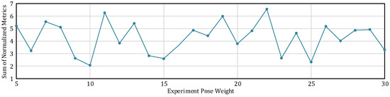 Figure 8 and Figure 9 show the experiments result for key-point recognition and the overall recognition result for the connection between terminals and cables, respectively. To further explore the relationship between the weight of the key-point loss function and the model’s recognition performance, all the results shown in Figure 8a–d and Figure 9a–d are normalized, then we calculate the sum of the eight normalized values corresponding to each weight. The results are shown in Figure 10. From the figure, it is evident that the model’s comprehensive performance is best when the weight is 22.