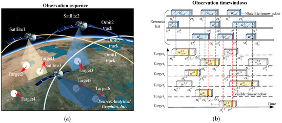 - The set of visible time windows of the target mission ,, where denotes the visible time window of the target , and and denote the start and end times of the visible time window of the target mission, respectively.