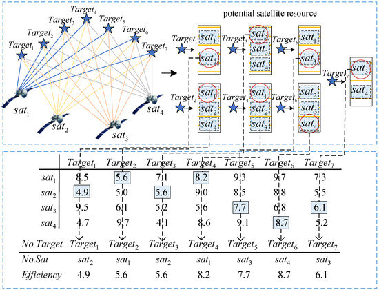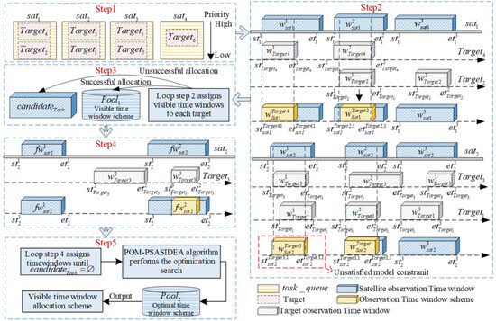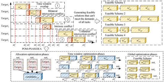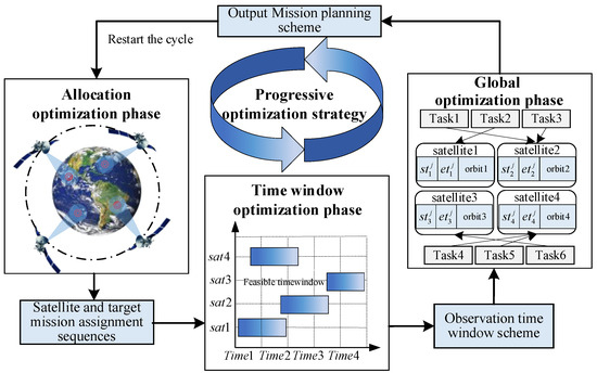 - In terms of the mission planning methodology, we propose a progressive optimization mechanism. Firstly, an initial task planning scheme is generated in the allocation optimization phase, which contains the allocation sequences of satellites and target tasks. Secondly, in the time window optimization phase, an execution time window is assigned to each target task based on the planning scheme in the allocation optimization phase. Finally, the planning results of the previous two phases are combined in the global optimization phase to generate the final mission planning scheme. Through stage-by-stage incremental decision-making, conflicts between planning schemes can be reduced, and the utilization rate of satellite resources can be effectively improved.