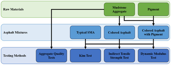 In this study, the evaluation of the structural capacity of colored asphalt pavement with mudstone as aggregate is conducted. Moreover, the effect of the added pigment on the asphalt binder to the strength of the colored asphalt pavement is investigated. Initially, the quality of mudstone aggregate was evaluated based on the Korean standards. Subsequently, three laboratory tests were conducted to three different laboratory specimens composed of different asphalt mixture: typical stone mastic asphalt (SMA) to serve as the baseline reference of the comparison of results, colored SMA replacing only the aggregate with mudstone, and colored SMA with mudstone as aggregate and additional red pigment in the binder. The laboratory tests included the Kim test, indirect tensile (IDT) strength test, and dynamic modulus test, which measure the deformation resistance, crack resistance, and the viscoelastic properties of the pavement material. Figure 1 summarizes the flow of this study.