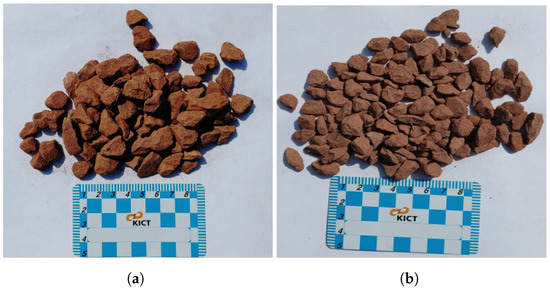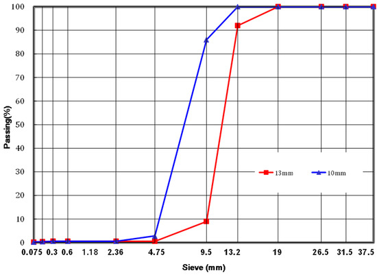 In this study, two sizes of coarse aggregates are replaced by mudstone aggregates, 13 mm and 10 mm, to produce the colored asphalt mixture. In accordance with the Korean standard for the use of single-particle size aggregates in the production and construction of asphalt mixtures, the 13 mm and 10 mm mudstone aggregates are sieved to satisfy the required gradation for each particle size. Table 2 summarizes the required percentage gradation of each single-particle size aggregate, and Figure 3 shows the gradation of the mudstone coarse aggregates. Additionally, samples of each particle size of the mudstone coarse aggregates are shown in Figure 4 for visualization.
