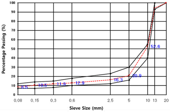 The combined aggregate gradation for the SMA mixture used in this study is shown in Figure 5. The upper and lower limits of the combined gradation for the SMA mixture are obtained from the Korean standard for the SMA mixture [18]. Three types of asphalt materials are considered in this study: typical SMA with usual granite aggregates, colored asphalt with 13 mm and 10 mm coarse aggregates replaced with mudstone aggregates, and pigmented colored asphalt with the same alteration to the coarse aggregate and additional 1.5% red pigment to the binder for enhanced color visibility of the asphalt mixture. Figure 6 presents a side-by-side comparison of the three asphalt materials.