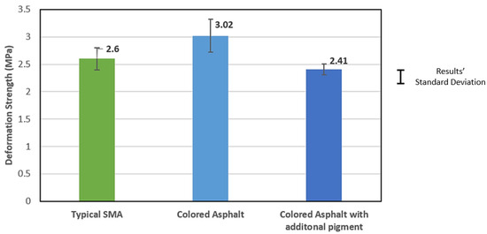The results of the Kim test for the three test specimens are shown in Figure 9. It can be observed that the colored asphalt mixture’s deformation strength, with a value of 3.02 MPa on the average, is significantly superior compared to the other materials with average values of 2.60 MPa and 2.41 MPa for typical SMA and colored asphalt with pigment, respectively.
