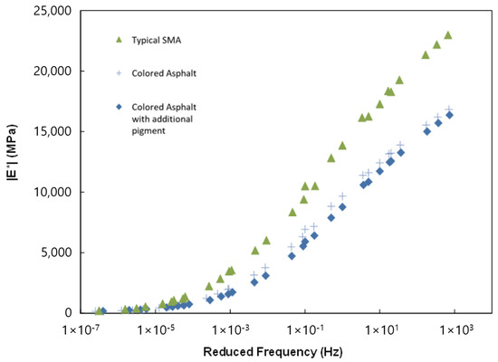The results demonstrate that the typical SMA exhibits a higher elastic modulus across various temperatures compared to both colored asphalt and colored asphalt with additional pigment. The elastic moduli of the colored asphalt and colored asphalt with additional pigment remain almost identical across all temperature ranges. Notably, the higher elastic modulus of the typical SMA at lower temperatures indicates increased stiffness and brittleness, which could potentially reduce its crack resistance. Conversely, at elevated temperatures, all three mixtures show similar elastic moduli, suggesting comparable resistance to plastic deformation across the mixtures.