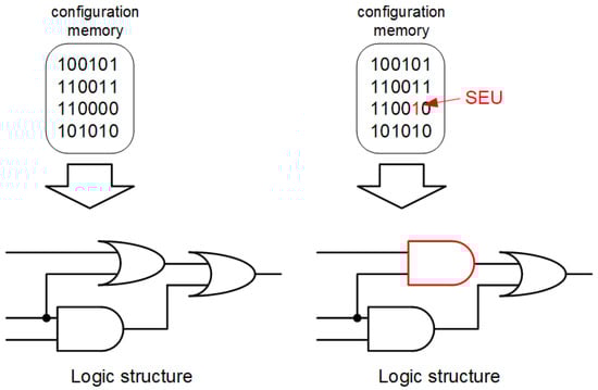 In many space missions, key digital-system elements are implemented in FPGA devices (telemetry systems, onboard computers and AI systems) [16,17,18,19,20]. This raises the question of mitigation methods targeting FPGA devices. An extremely important component of FPGA devices is the configuration memory. This is most often SRAM (Static Random-Access Memory), which stores information on how to configure and interconnect the available resources of the FPGA device in the logical structure. As a result of SEUs, the values of selected configuration bits in the configuration memory can be swapped, which will affect the resulting logical structure. This problem is illustrated in Figure 1.