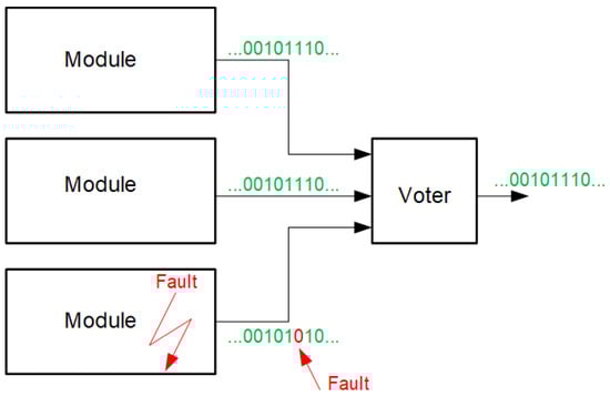 An extremely important method of mitigation is redundancy. The use of redundancy in mitigation processes involves replicating selected functional blocks or circuits several times in order to perform exactly the same task. In extreme cases, where the space mission is specifically exposed to significant radiation, entire units are duplicated. If the duplicated modules, at the same time, function in exactly the same way (the state of their outputs is the same), this means that there have been no SEE-induced errors in the operation of the modules. If, however, the signals on their outputs are different, this means that a fault must have occurred in one of the duplicated modules. Naturally, duplicating parts of a circuit, modules or entire devices several times is expensive. This raises the question of how many times a circuit fragment should be duplicated to ensure effective mitigation. It turns out that replicating the circuit twice only allows statements to be made that an SEE phenomenon has occurred but without the possibility of error correction. For this reason, triple redundancy (TMR, triple modular redundancy) is commonly used. In this approach, three identical and independent modules perform the same functionality. If one of them malfunctions due to an SEE, by comparing the state of the outputs of all three modules, the expected (correct) state of the module’s outputs can be unambiguously determined by a voting process. Of course, a single fault is assumed. Thus, in order to realise TMR, it is necessary to have a voter comparing the outputs of the individual modules and realising the voting. The essence of TMR is illustrated in Figure 2.