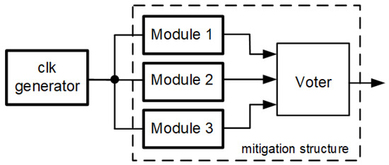 TMR is one of the basic mitigation techniques. It is the subject of many scientific papers [28,29,30,31,32]. It should be noted that one of the main drawbacks of this approach is the significant growth of the logical structure obtained. The use of TMR significantly increases the number of logical resources used. There are methods to reduce them [33,34]. Naturally, it is also extremely important to adopt a strategy for using TMR in a project [35].
